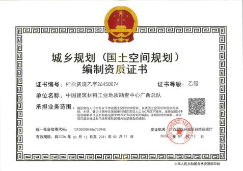 近日,经自治区自然资源厅严格审查,广西总队顺利通过审批,正式获得“城乡规划编制(乙级)”资质!标志着总队在城乡规划领域的综合实力得到权威认可,为总队拓展业务领域、提升市场竞争力奠定了坚实的基础。